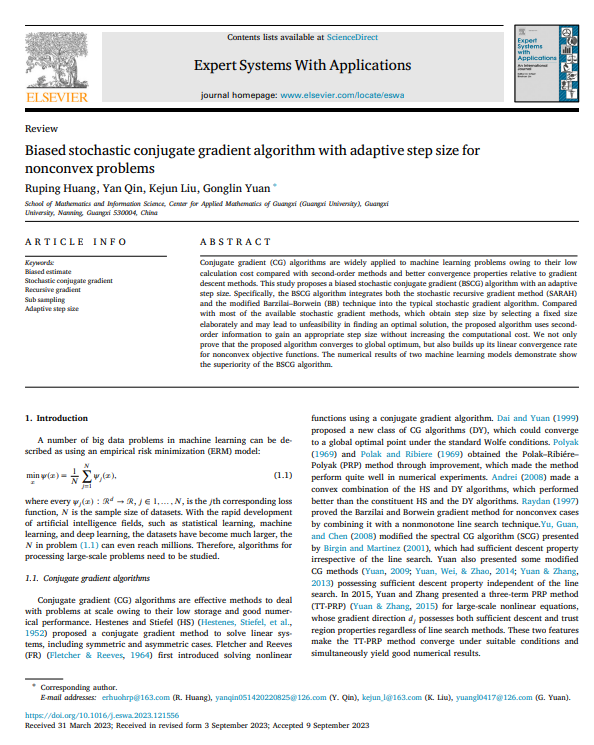 2023年10月21日,9728太阳成集团袁功林教授与其在读硕士研究生黄汝平、秦燕和刘科俊合作在人工智能类期刊《Expert Systems with Applications》上在线发表了题为“Biased stochastic conjugate gradient algorithm with adaptive step size for nonconvex problems”的学术论文,实现了公司数学学者在该刊发表论文零的突破,是公司实行学科交叉融合的学术成绩之一,太阳成集团tyc9728为该论文的唯一完成单位。